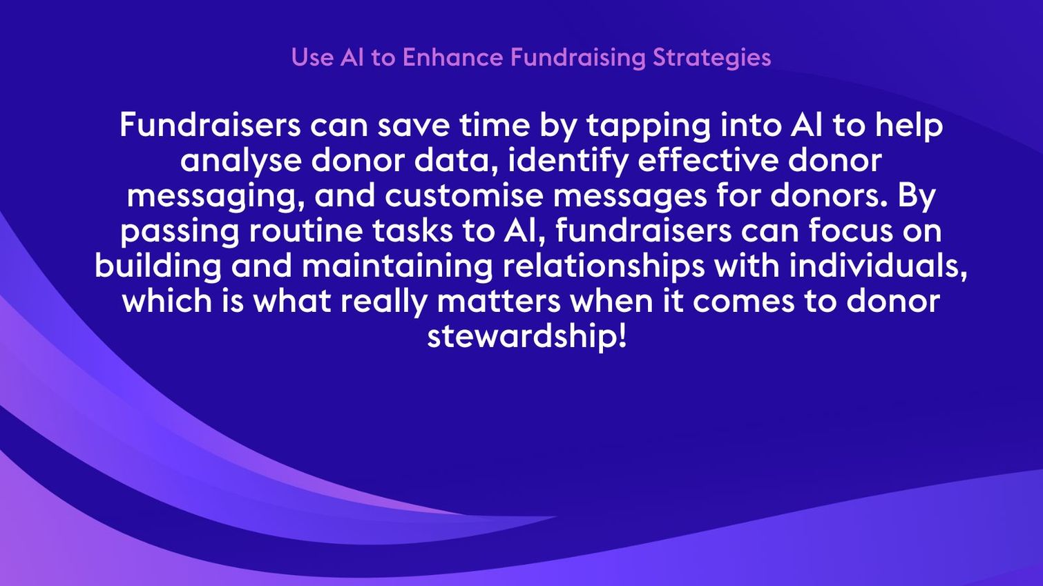 As we mentioned already, there are a number of ways that AI can reduce the burden on grassroots organisations, and saving time is definitely music to a fundraiser’s ears! From identifying effective donor messaging to analysing donor data, AI can help elevate fundraising strategies. AI can be used to customise messages to donors of every level, ensuring their donation is recognised and thanked in a personalised manner. People connect with people, and so passing mundane tasks over to AI will free up time for fundraisers so they can focus on what they do best - building and maintaining relationships with individuals.