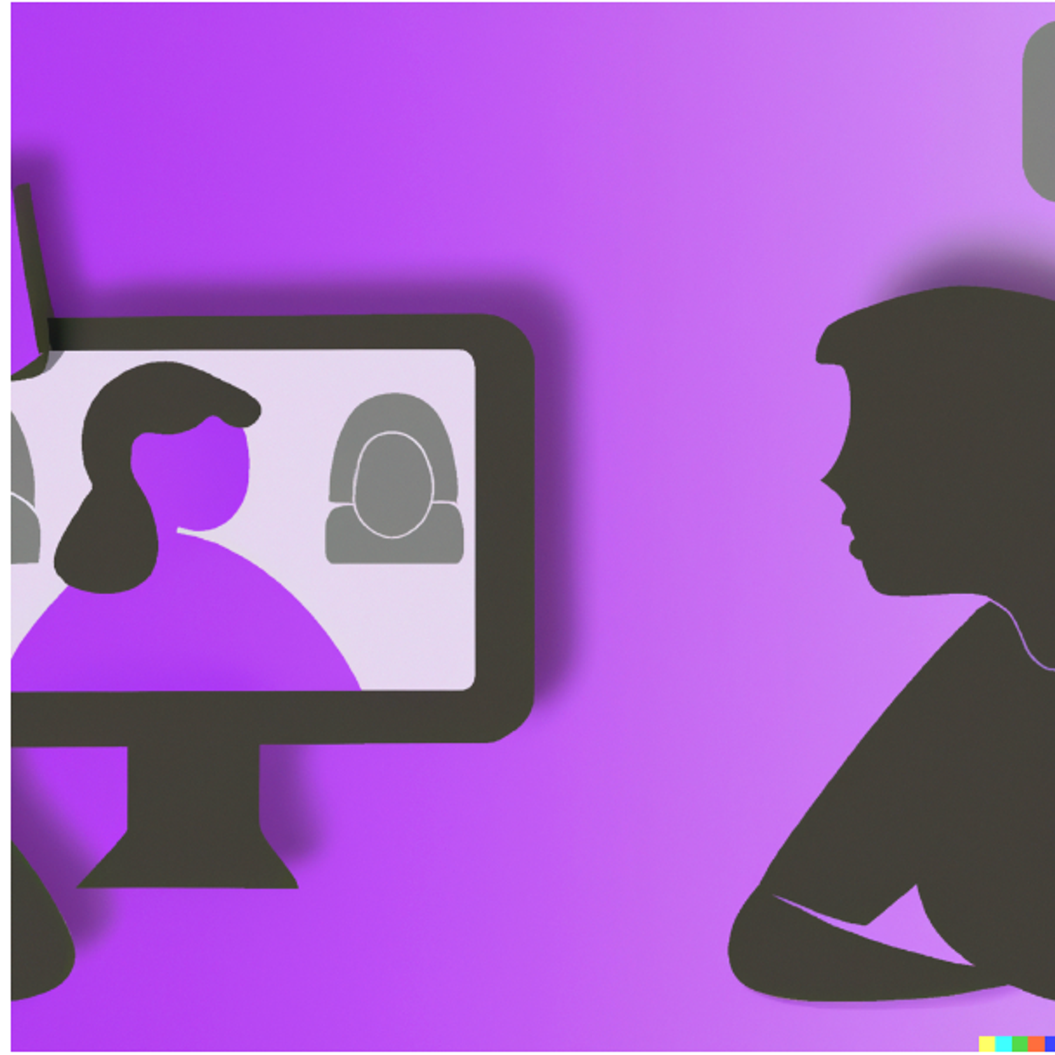 (Depict an interview between a human and a computer, in shades of purple, as an abstract image, via DALL-E)