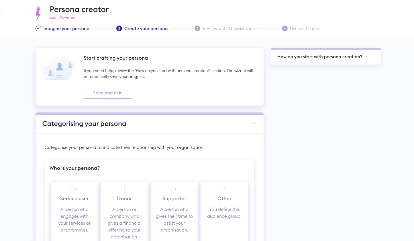 To support our nonprofit community in creating personas more efficiently, we've developed the Persona Creator. This tool makes it easy and enjoyable to build detailed personas in just a few minutes - powered by Lumi, our suite of AI-enhanced tools.