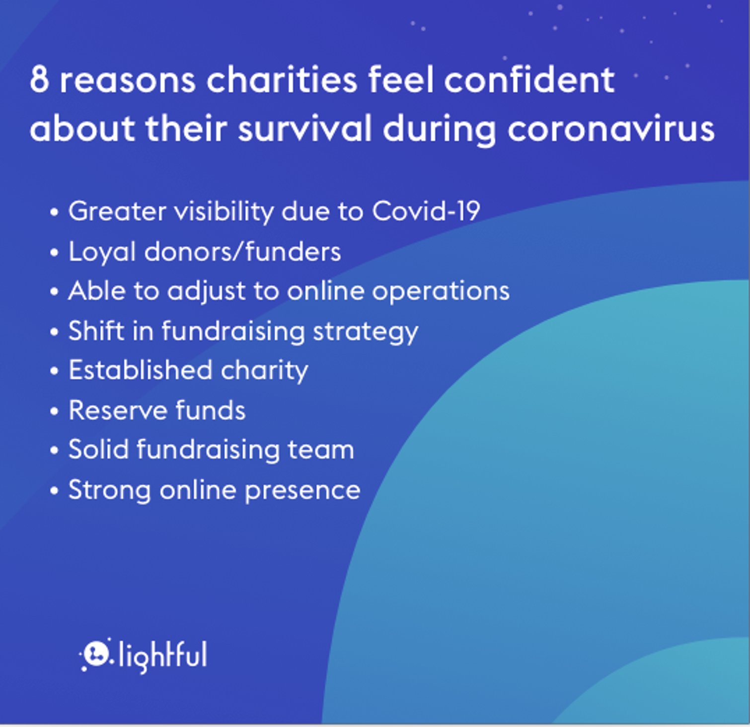 Charities that are feeling confident right now about their survival rely on a strong online presence, loyal donors, rapid shifts in their fundraising strategy and quick adjustment to online operations. Moreover, working in essential areas and having reserve funds can be of great value.