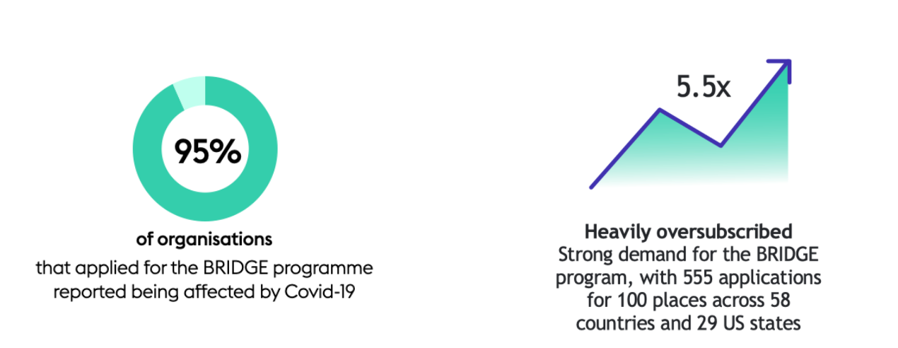 When we onboard a BRIDGE cohort we usually ask the participating nonprofits about the key challenges they face, so that we can tailor and tweak the programme to best support their needs. But from May to July 2020, when we onboarded 200 nonprofits from 22 countries, the feedback on the impact of the pandemic was deeply concerning- 95% of participants told us that they were being negatively affected by Covid-19, and many told us they did not think their organisations would survive. It was not a surprise that our programme, which equips nonprofits with digital communications and fundraising skills, was 5 times oversubscribed.