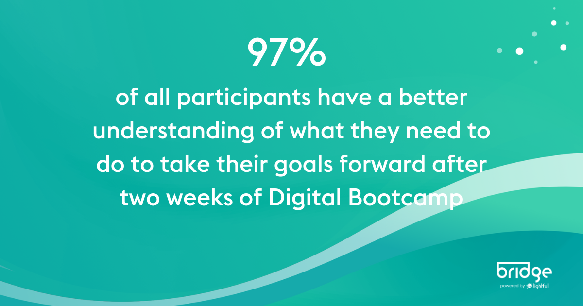 - 97% of all participants told us they have a better understanding of what they need to do to take their goals forward after two weeks of Digital Bootcamp