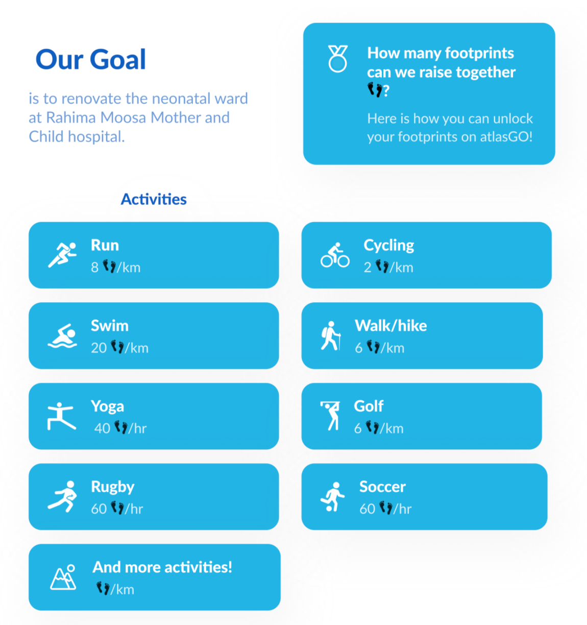The Footprints 4 Sam World Giving Series is a challenge event where participants are encouraged to exercise and move as much as they can for three months, earning footprints along the way. Every three months a new challenge will begin, with funds going to a different element of the organisation's work. The first series raised over 200,000 rands for the renovation of the Neonatal ICU (NICU) unit at the Rahima Moosa Mother and Child Hospital in Johannesburg, South Africa!
