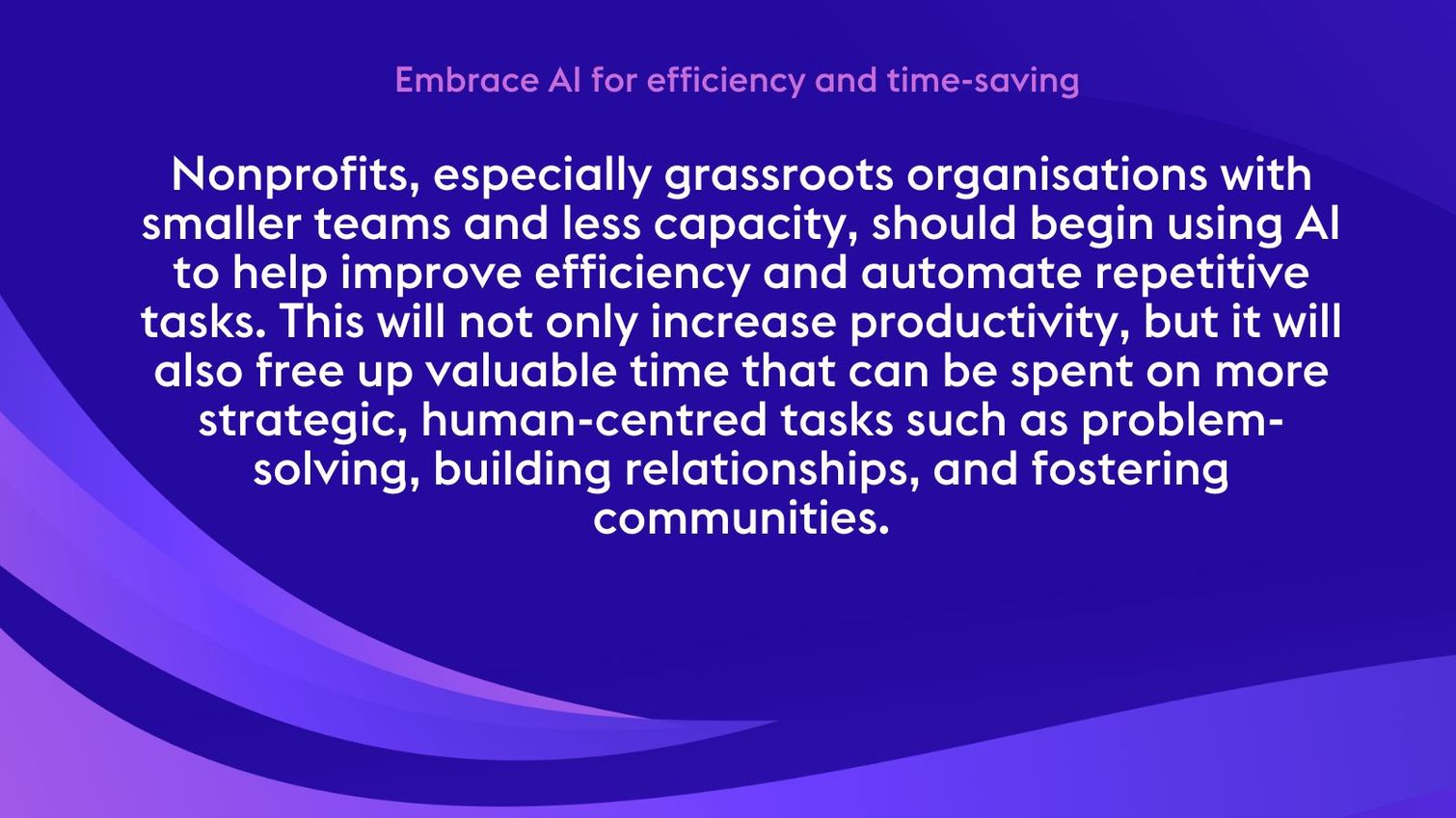AI tools will be coming your way whether you like it or not so it’s important that nonprofits feel prepared and confident entering this new era of technology. Particularly for grassroots organisations with smaller teams and less capacity, AI can help organisations improve efficiency, and automate repetitive tasks that take up so much time.
