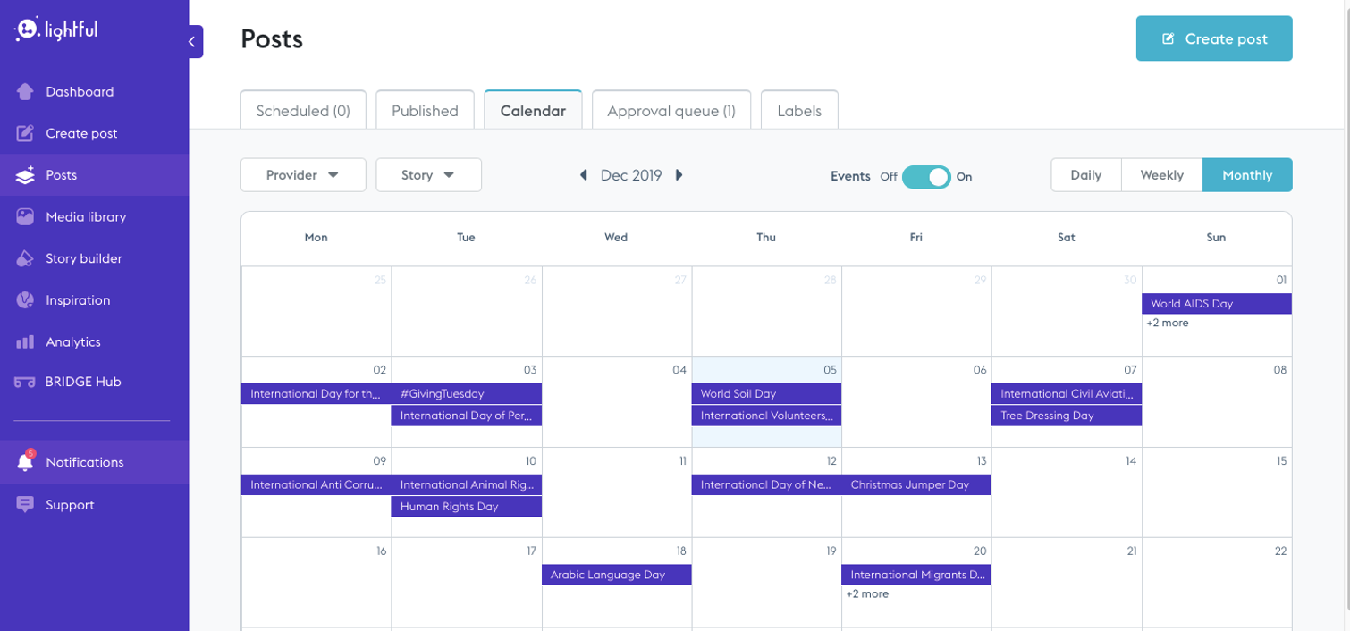 You don’t want to miss an important awareness day that is relevant to your organisation. A good way to stay up-to-date is to look at the monthly view of the Lightful calendar.