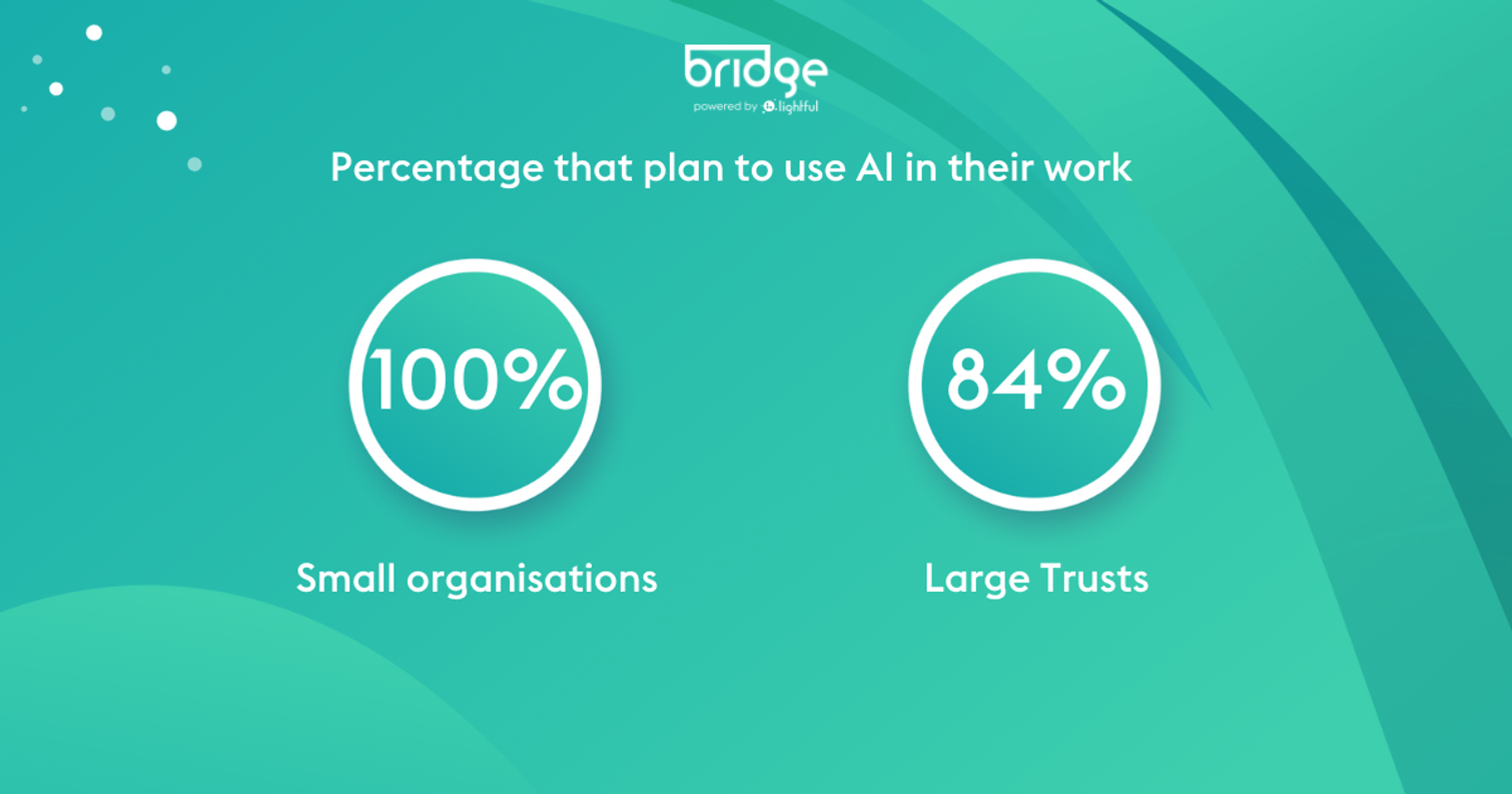 Interestingly, all the small organisations intend to incorporate AI in their work, compared to 84% of large Trusts. It appears, at least for the smaller grassroots organisations, the perceived benefits supersede their concerns.