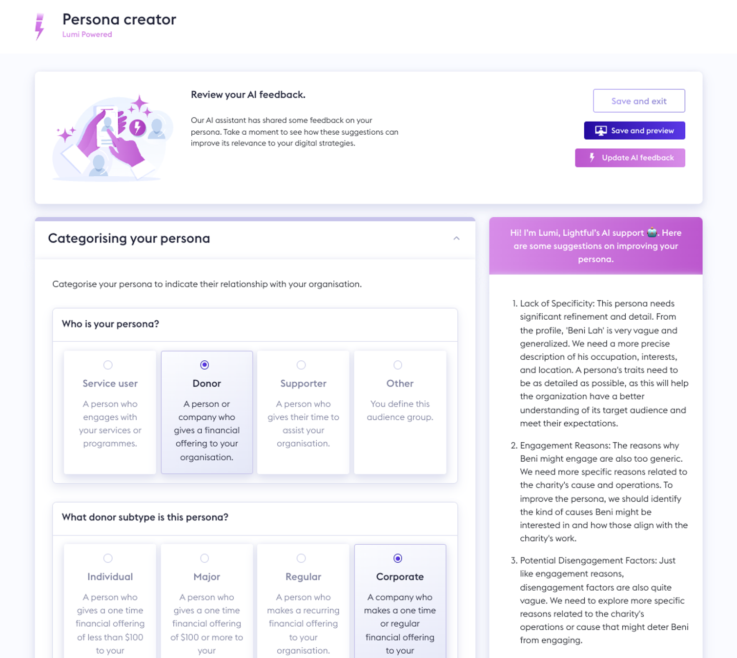 At Lightful, we are committed to empowering nonprofits with the tools - particularly those using the power of generative AI - they need to succeed in the digital age. Our Persona Creator is designed to simplify the process of persona development, enabling organisations to connect with their audience on a deeper level and achieve greater engagement online... leading to enhanced impact offline too.