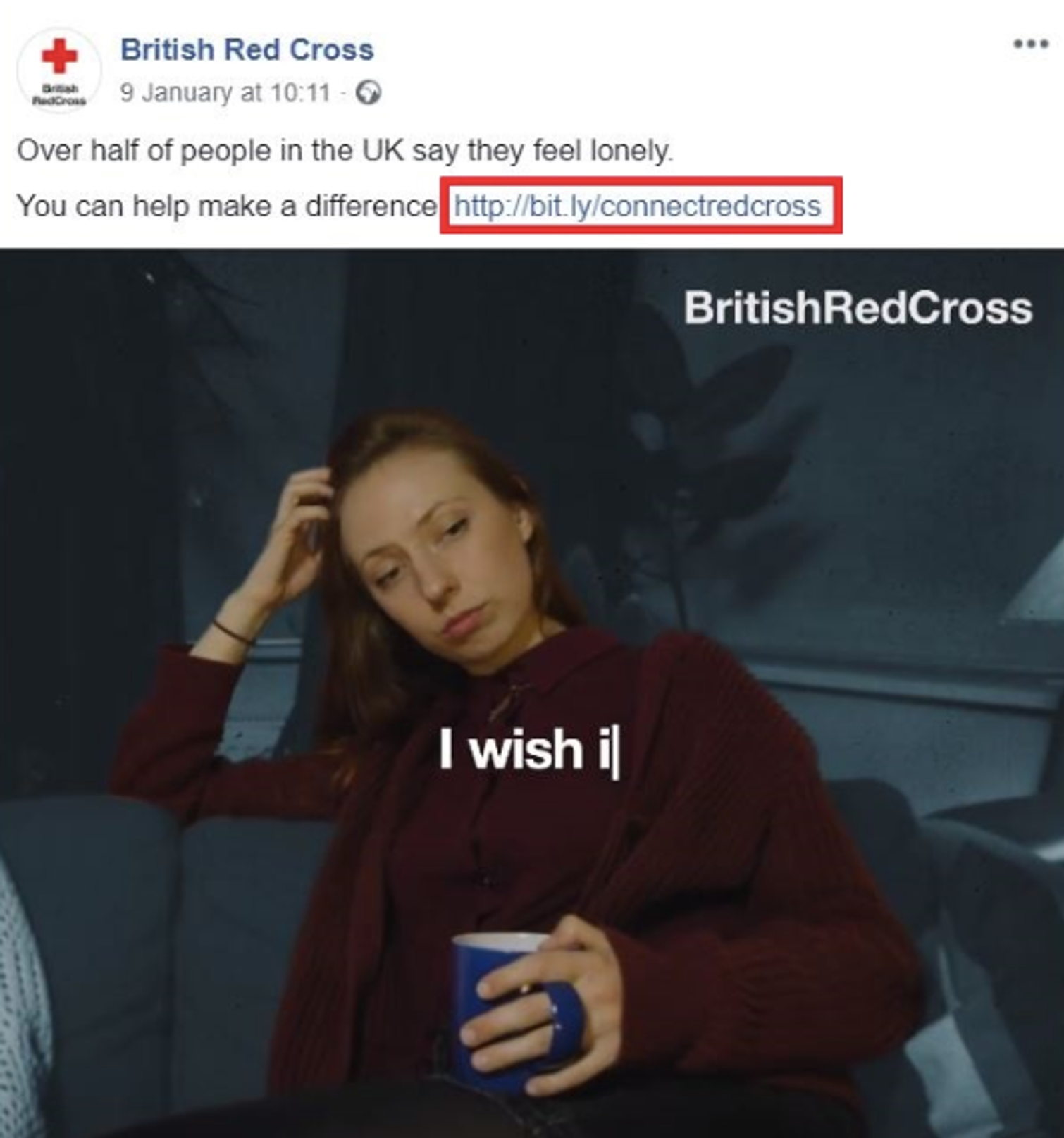 In this example from the British Red Cross, the bit.ly link takes you to their campaign landing page. They will have tested the link as well as added tracking to it. Notice that they have also customised the bit.ly link so that it fits in with their campaign, which is about connecting people to tackle loneliness.