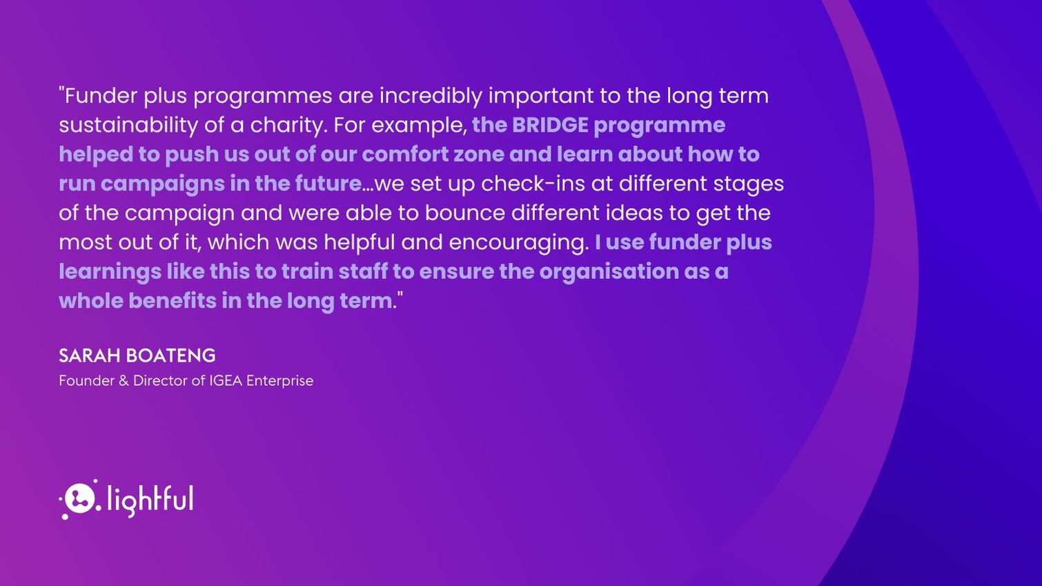 Our wonderful panel included Tessa Durham, Co-Director of Gower Street foundation, Sarah Boateng, Founder & Director of IGEA Enterprise charity and, finally, our Head of Programmes, Róisín McGovern, who took us through how Lightful’s BRIDGE programme works step by step. Tessa, Sarah and Adam shared their experiences of delivering and receiving funder plus initiatives, including the BRIDGE programme, and brought these initiatives to life - some of these insights are highlighted below.