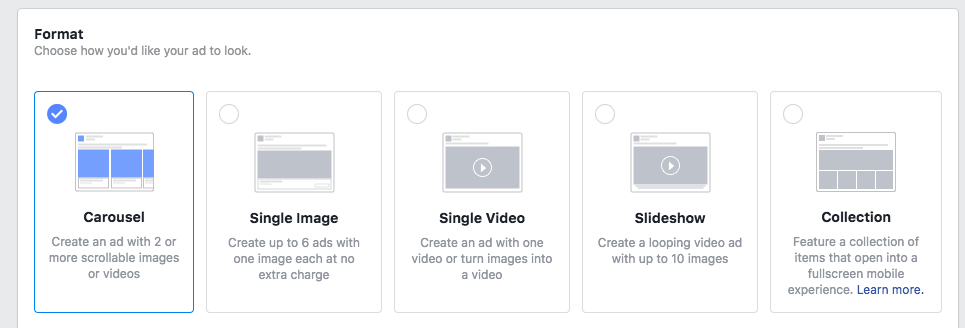 - Carousel: use multiple images or videos in one ad
