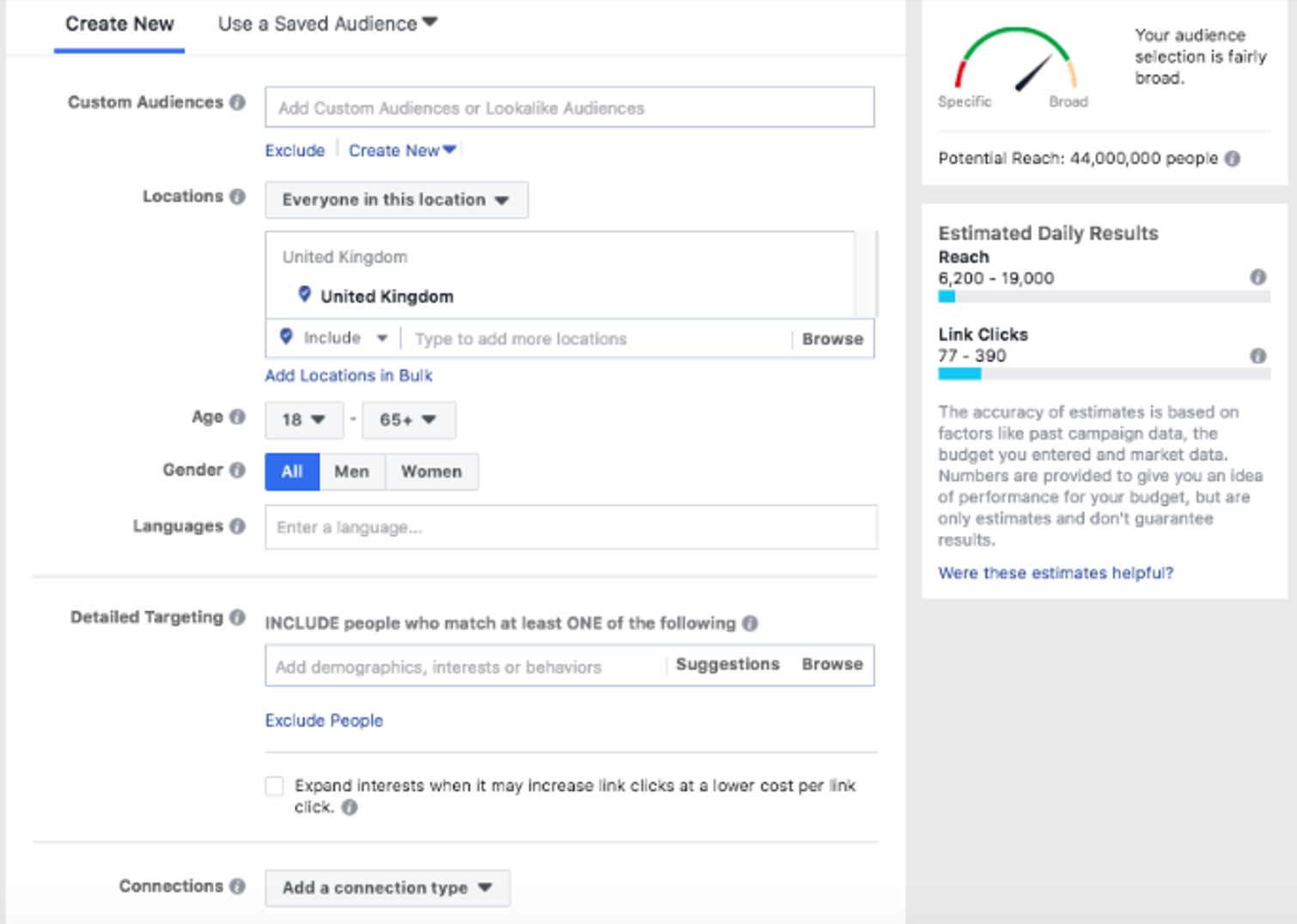 For example, you can target people who are based in the UK and who already follow your Facebook page. If you want to discover new supporters you can choose to exclude your page fans and reach people who match your personas.