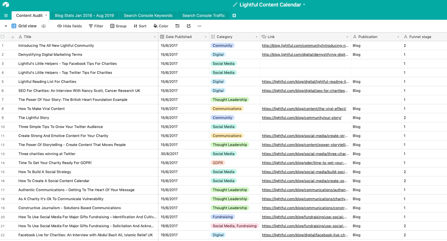 Using your project management tool, in our case Airtable, start adding each of your posts as a line item, including the scheduled date, the category (these might be donation asks, case studies or behind the scenes) as well as a link to any external content. You can also look at the kind of people you’re targeting with these posts using personas!