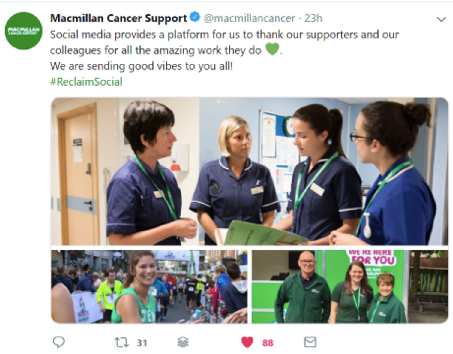 Macmillan used #ReclaimSocial as an opportunity to thank their supporters and colleagues.
