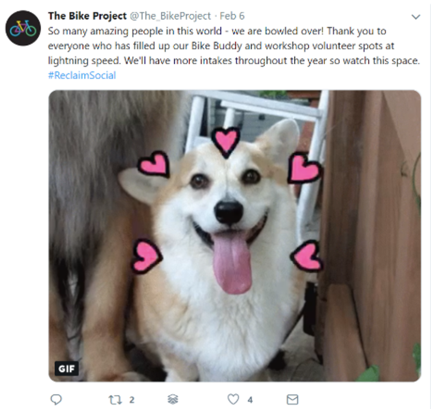The Bike Project thanked everyone who has volunteered for their Bike Buddy and workshop spots. Love their GIF game.
