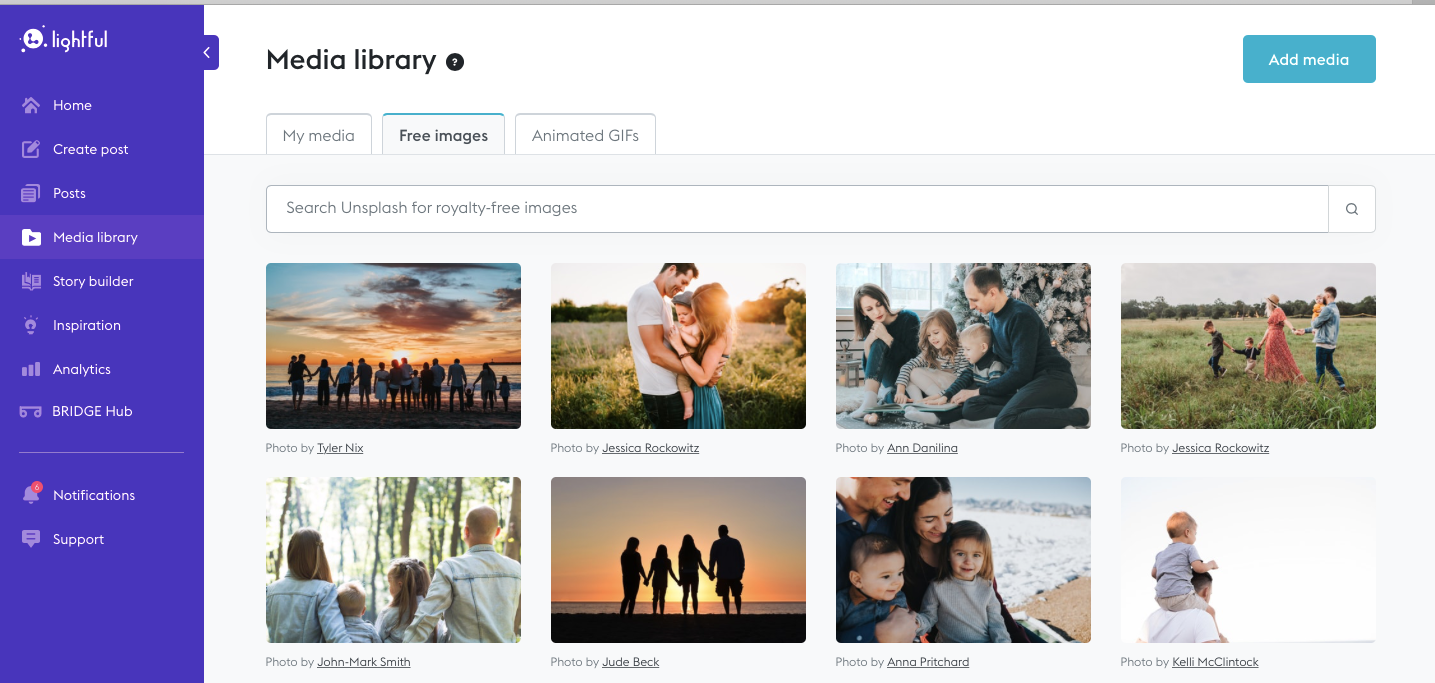 If you want to include images in your social media posts but don’t know what to include, we can help. Visit the Media Library in Lightful and click on Free Images to discover thousands of royalty-free images from professional photographers.