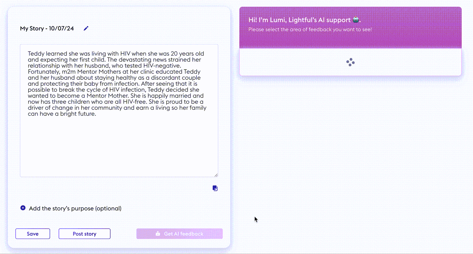 At Lightful, our mission is to help charities become better storytellers. We aim to encourage them to view digital platforms as a way to amplify not only their voice but also the voices of the communities and individuals they serve. Alongside our BRIDGE program's learning content, we're offering support for individual storytellers with the help of AI.
