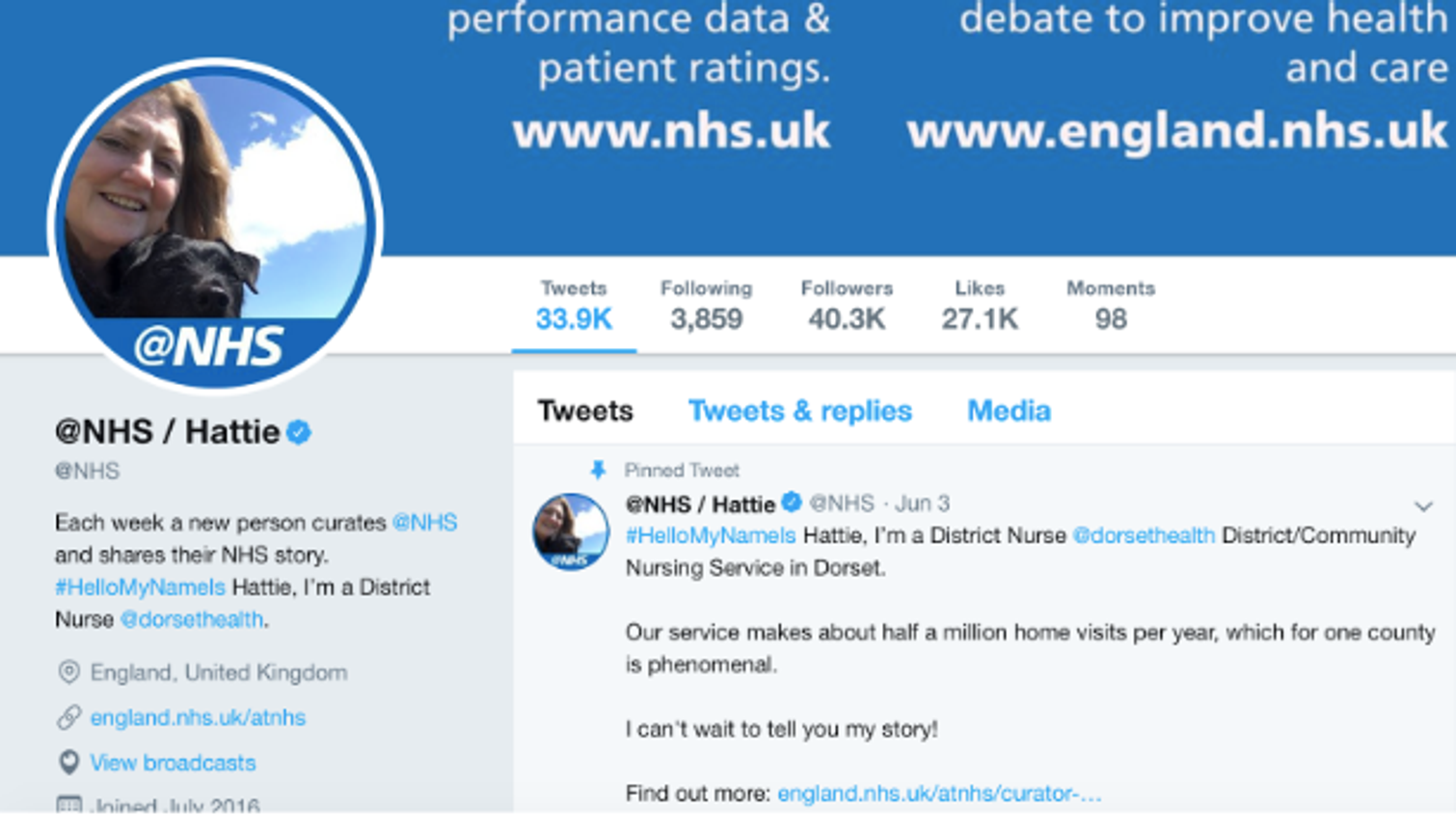The NHS let a new person take over their account every week to share their stories using the #HelloMyNameIs hashtag. Participants are mostly people working within the NHS, sharing their stories and experiences to highlight just how much work goes into providing healthcare to people all over the UK.