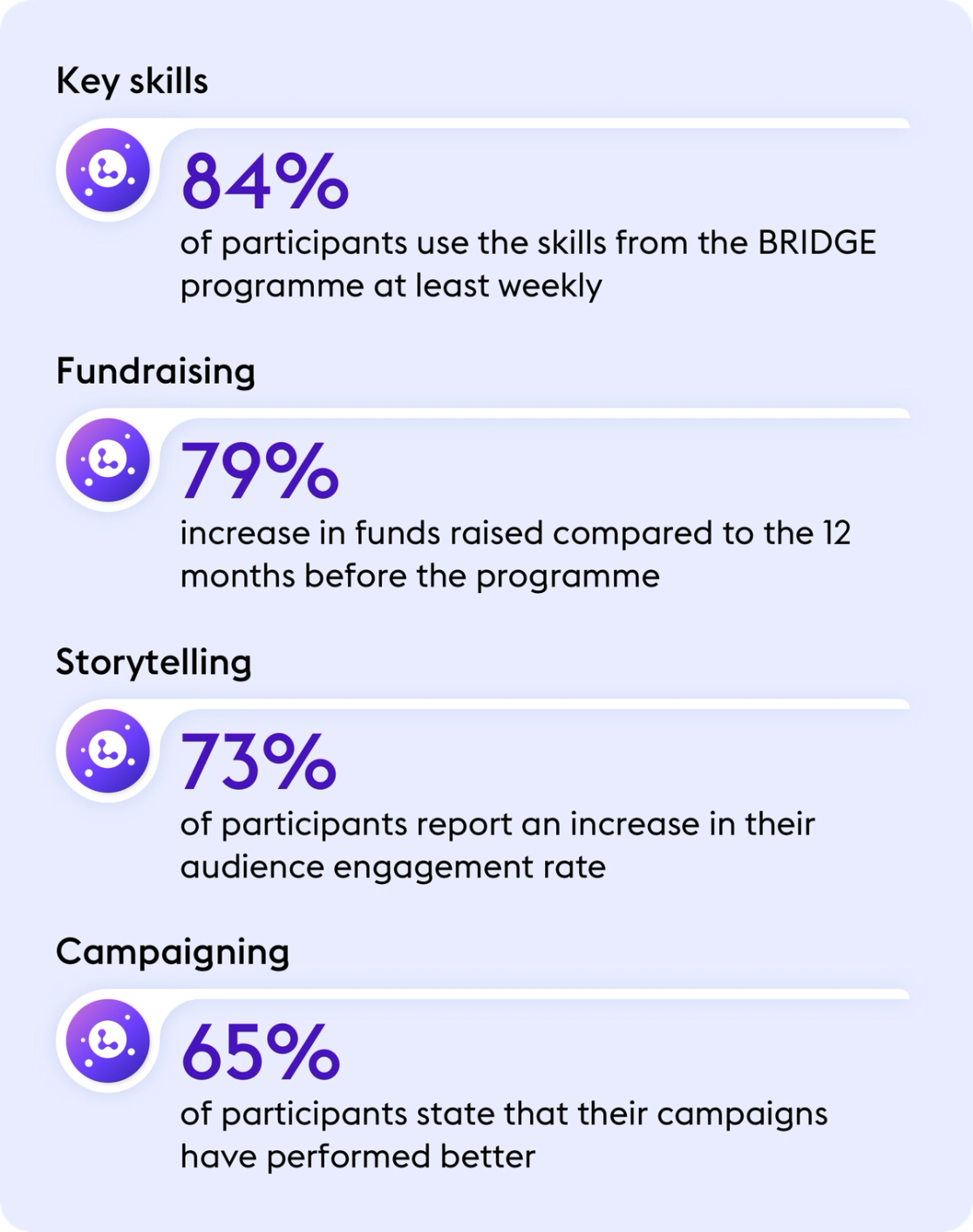 In December 2023, we launched a study to examine the impact of the BRIDGE programme on nonprofit organisations over the past five years. We asked about the impact of BRIDGE on their ability to tell authentic stores, enhance financial support for their vital work, and increase the positive effect on their communities. We received 253 responses from participants in 40 countries across Africa, Asia, Europe, South America and different corners across the USA, representing cohorts sponsored by 19 funders.